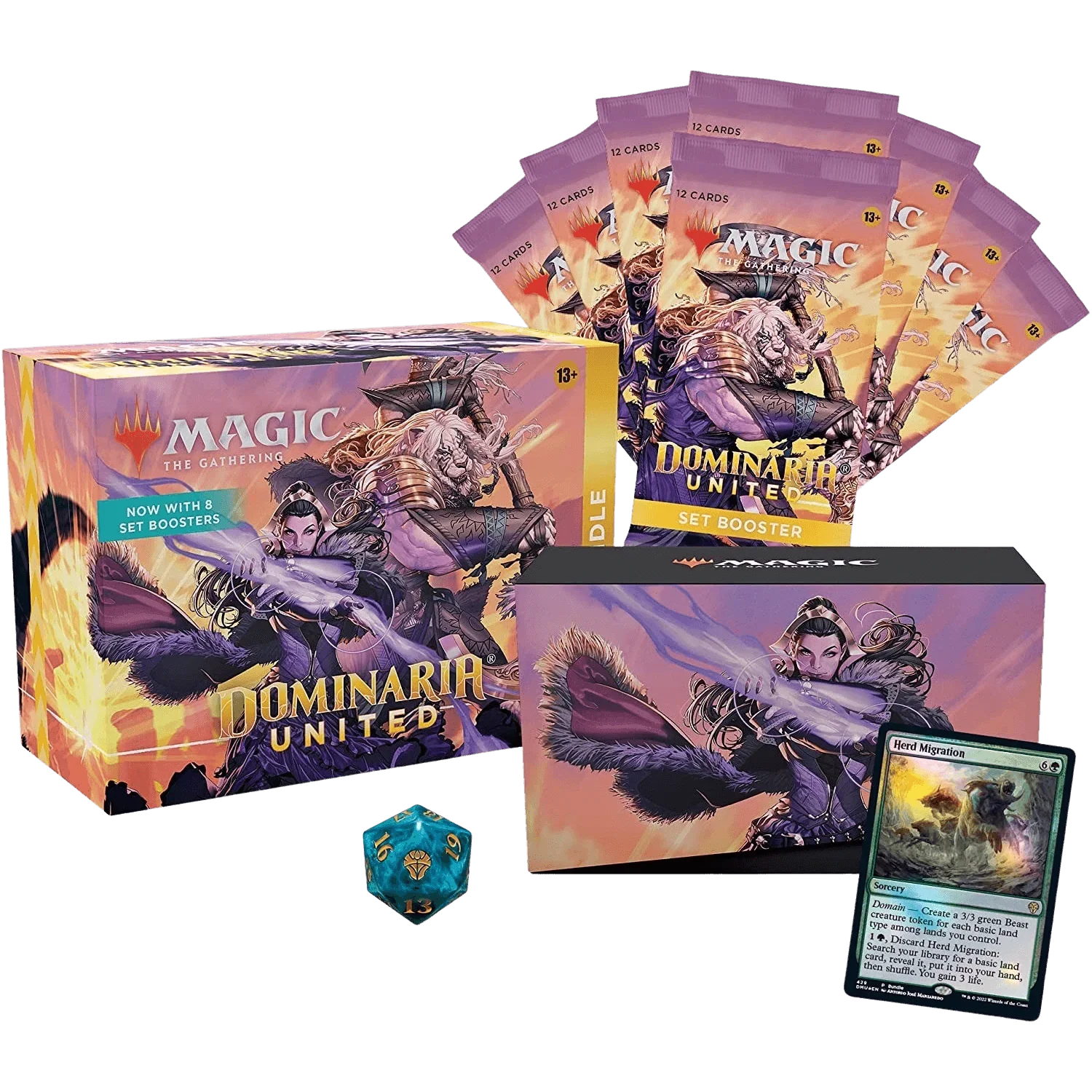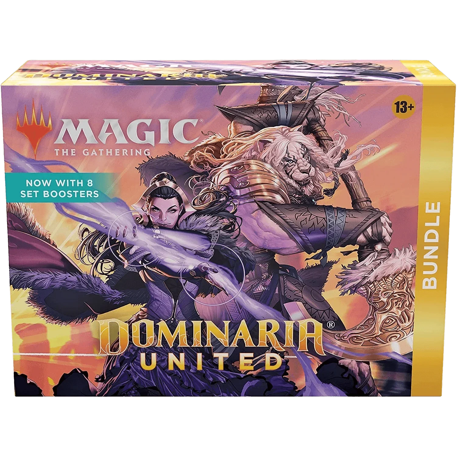 The Dominaria United Bundle contains 8 Set Boosters—the best boosters to open just for fun—plus exclusive accessories, with 40 basic lands (20 traditional foils and 20 nonfoils), 1 Traditional Foil promo card with Bundle-exclusive alternate art, 1 oversized Spindown life counter, 1 card storage box, and 2 reference cards.