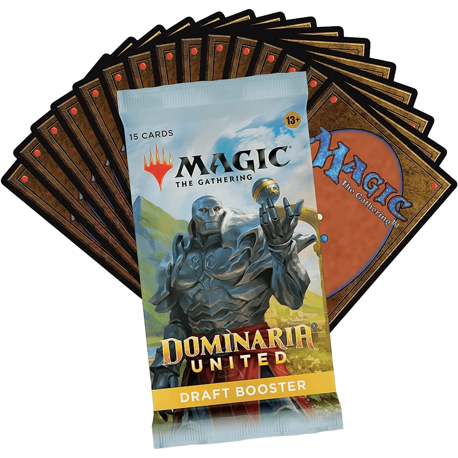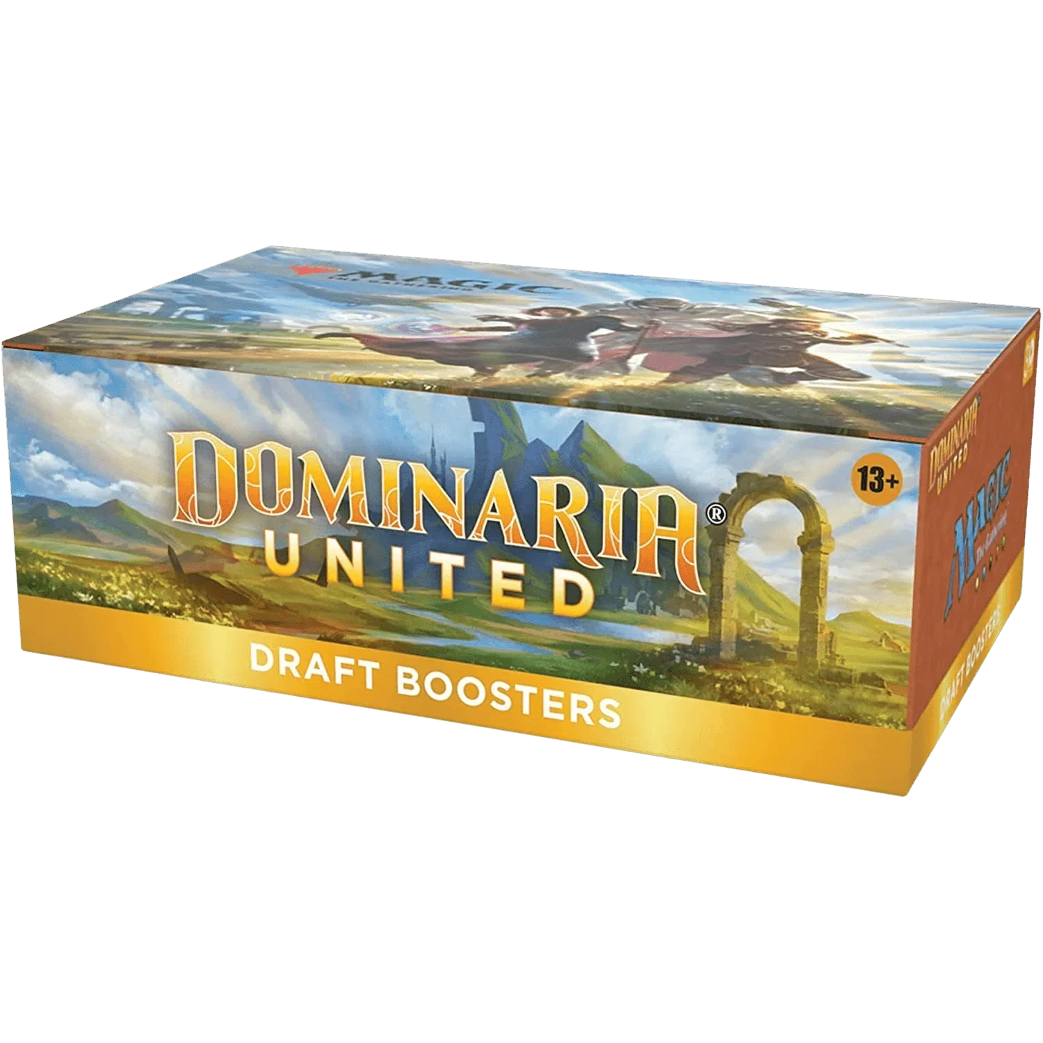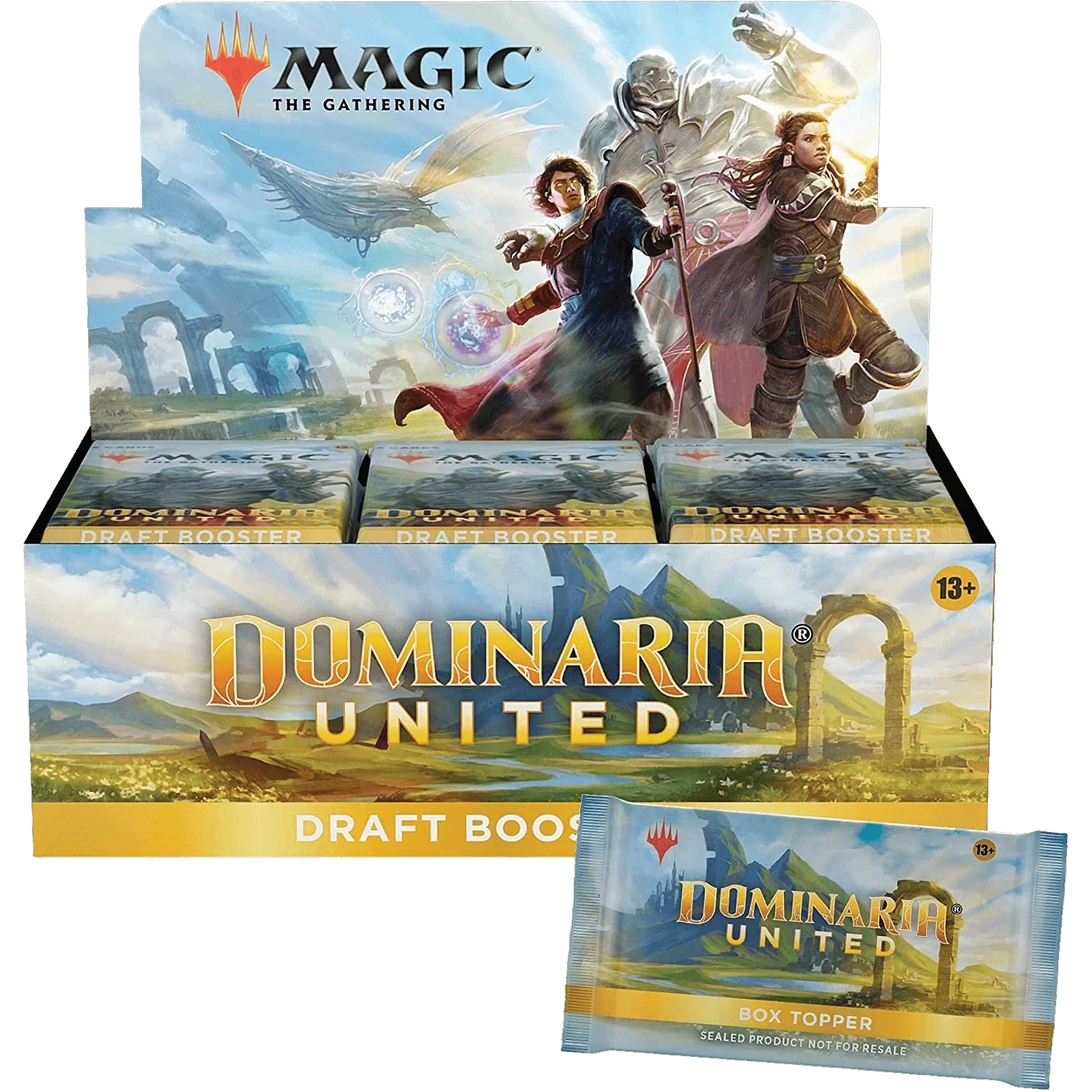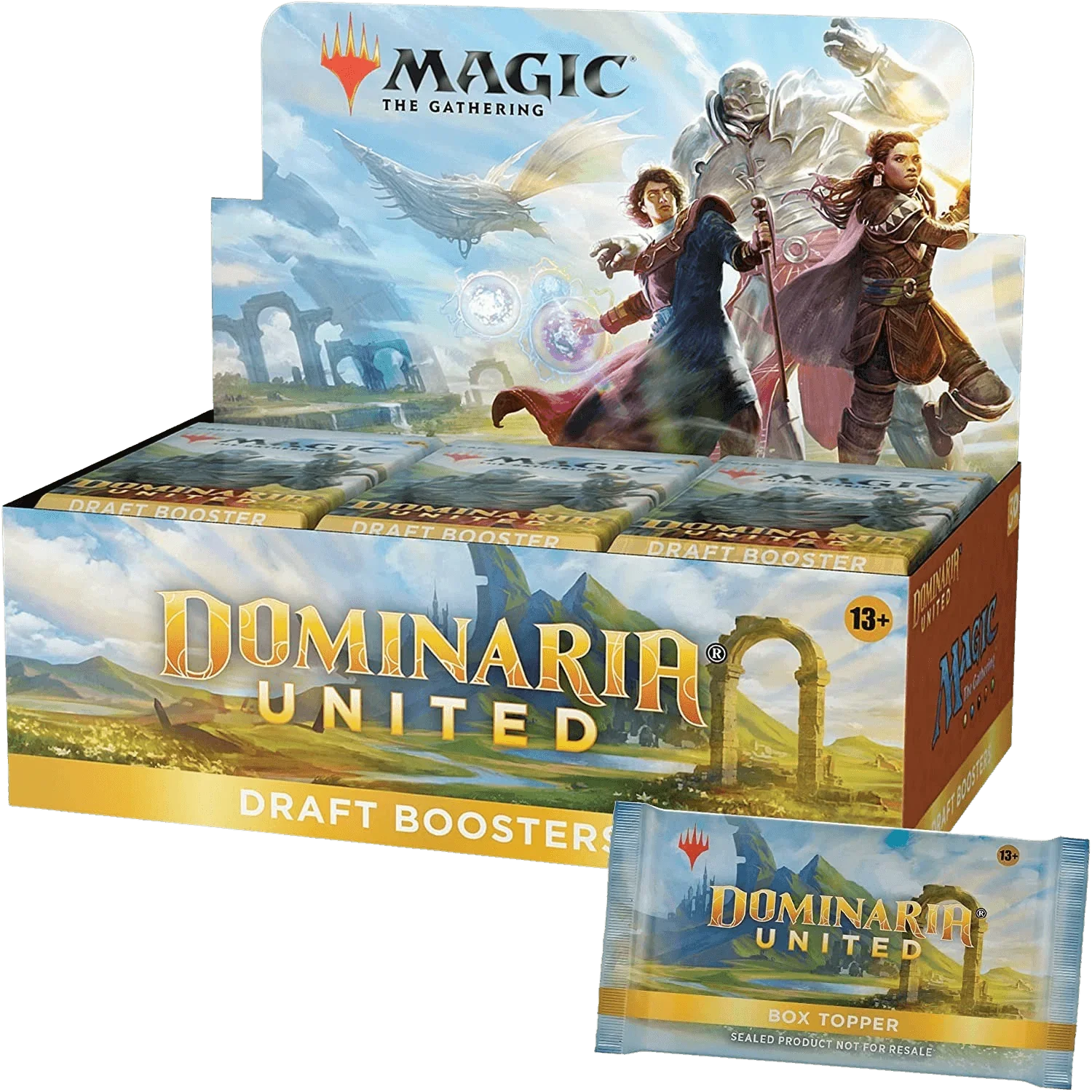 The Draft Booster Display contains 36 Dominaria United Draft Boosters and 1 Traditional Foil Box Topper card. Each Draft Booster contains 15 cards and 1 token card, including a combination of 1 card of rarity Rare or higher and 3 Uncommon, 10 Common, and 1 Land cards. There is also a chance to find a traditional Foil Borderless Mythic Planeswalker in <1% of boosters. Traditional Foil of any rarity replaces a Common in 33% of boosters.