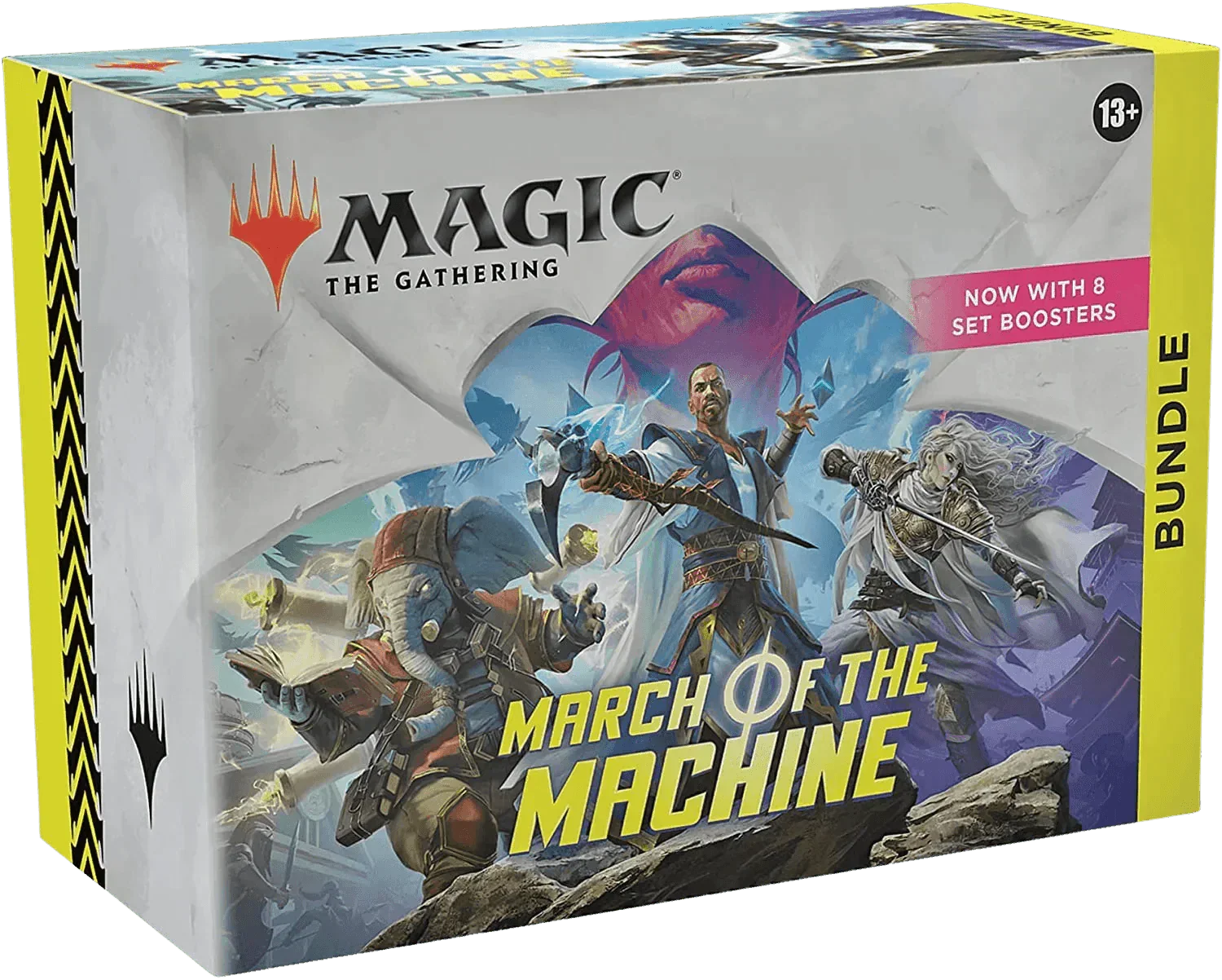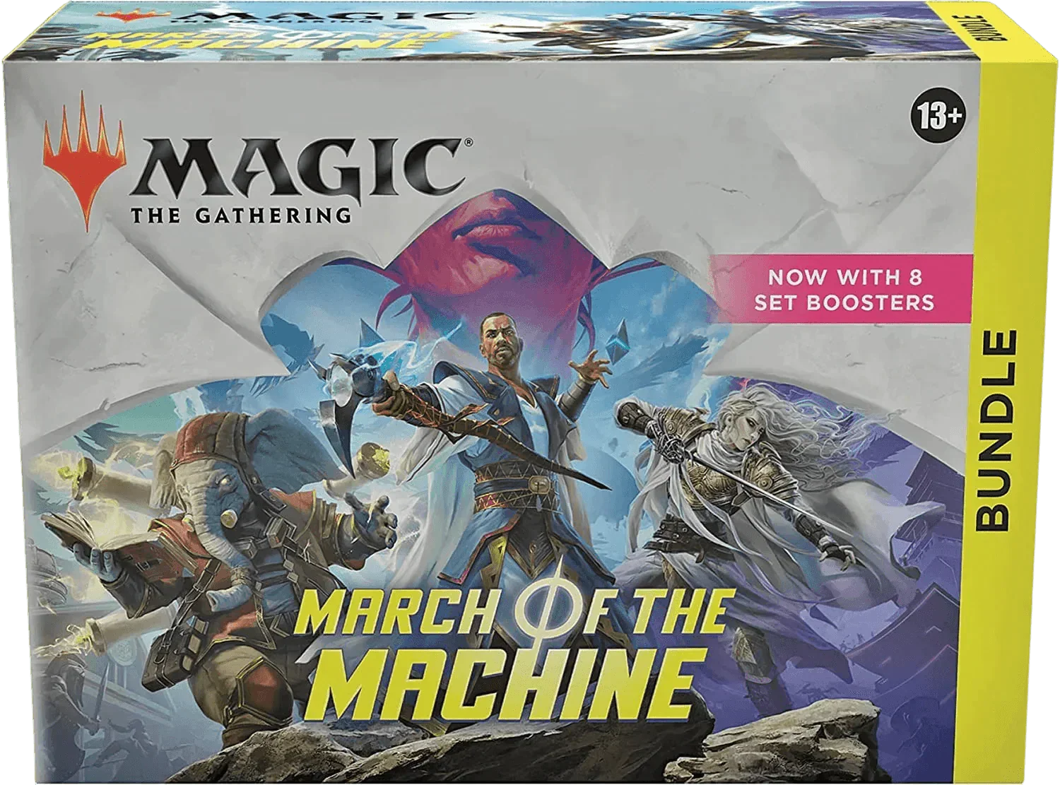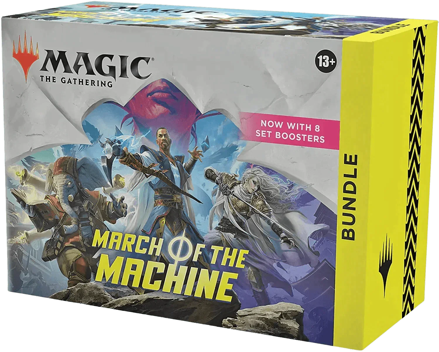 The March of the Machine Bundle contains 8 March of the Machine Set Boosters—the best boosters to open just for fun—plus accessories, with 1 traditional foil alternate-art promo card, 40 basic lands (20 traditional foils and 20 nonfoils), 1 oversized Spindown life counter, 1 card storage box, and 2 reference cards.