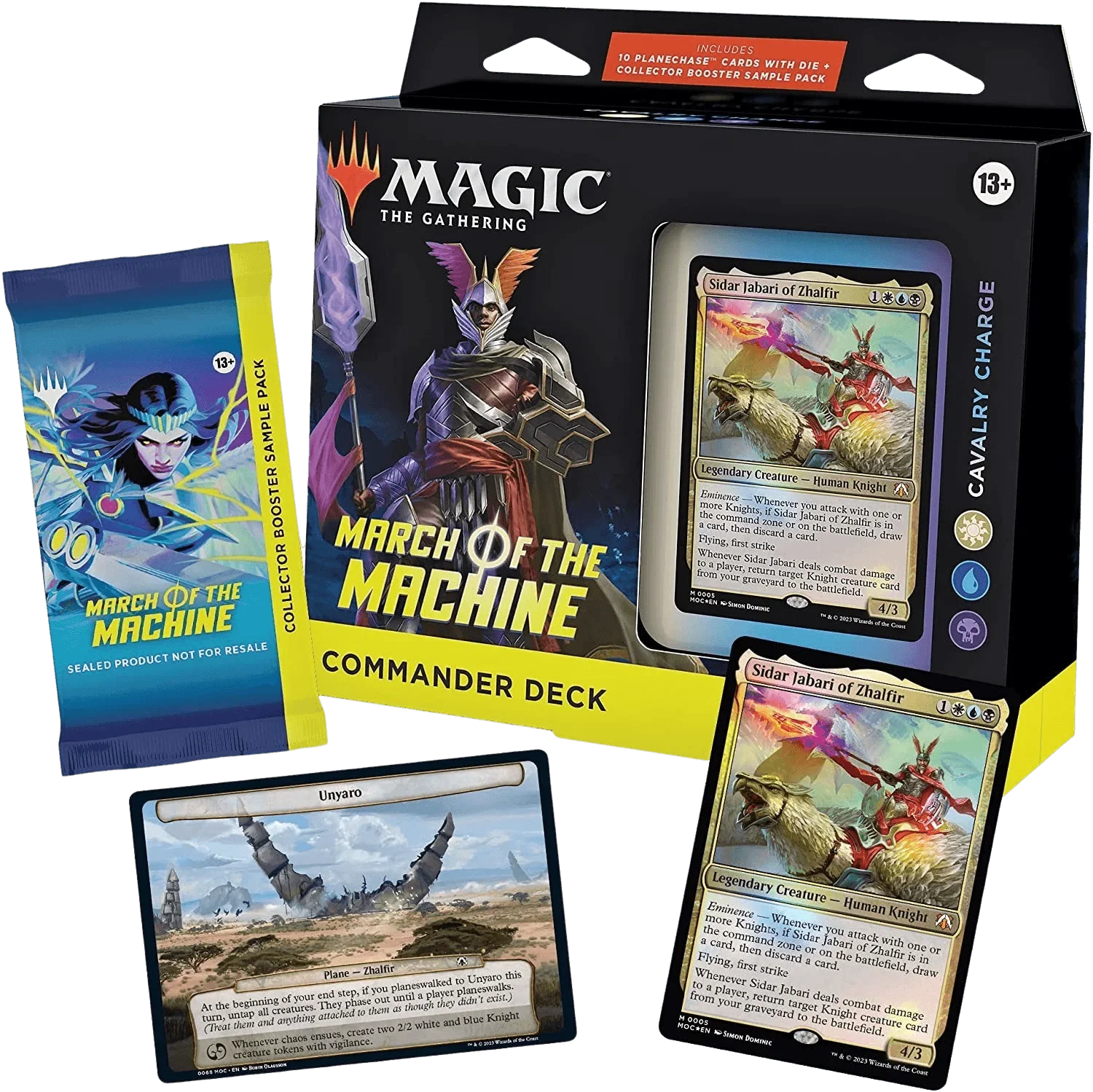 This March of the Machine Commander Deck set includes 1 ready-to-play deck of 100 Magic cards (2 Traditional Foil Legendary cards, 98 nonfoil cards), 10 specialty cards, a 2-card Collector Booster Sample Pack, 1 Foil-Etched Display Commander (a thick cardstock copy of the commander card with foil etched into the card’s border and art), 10 double-sided tokens, 1 deck box (can hold 100 sleeved cards), 1 Life Wheel, 1 special die, 1 strategy insert, and 1 reference card.