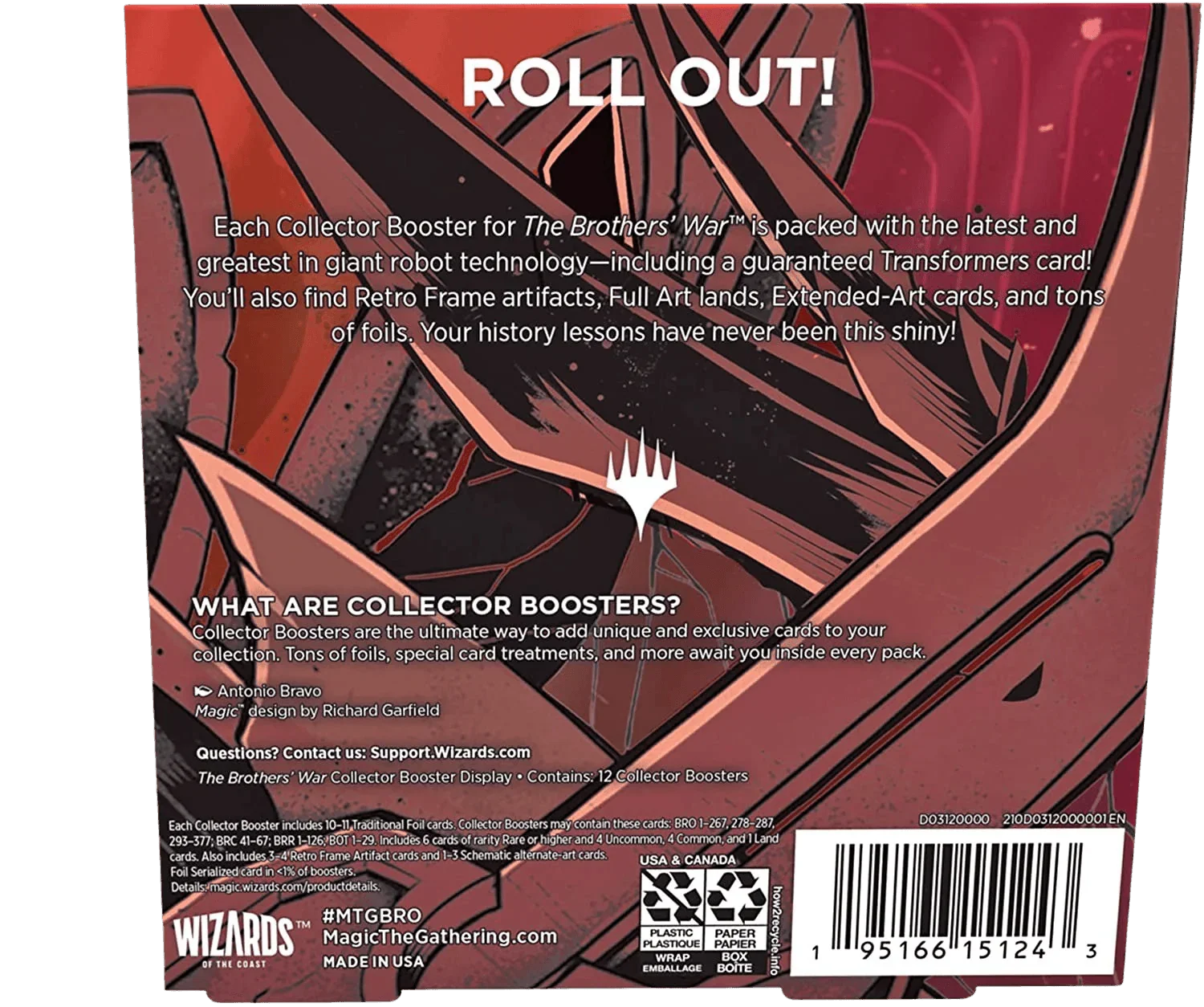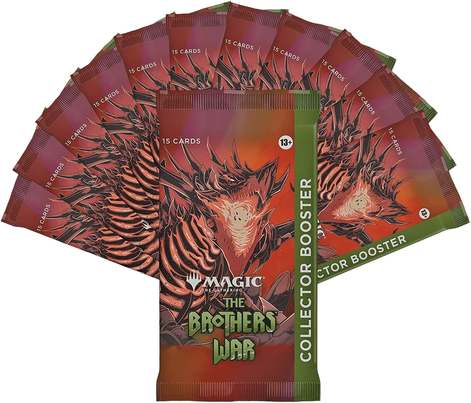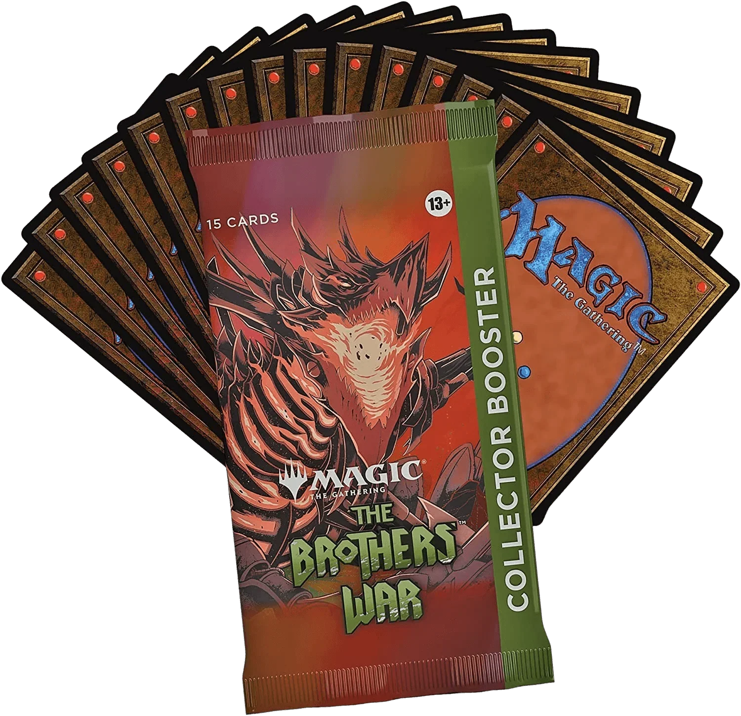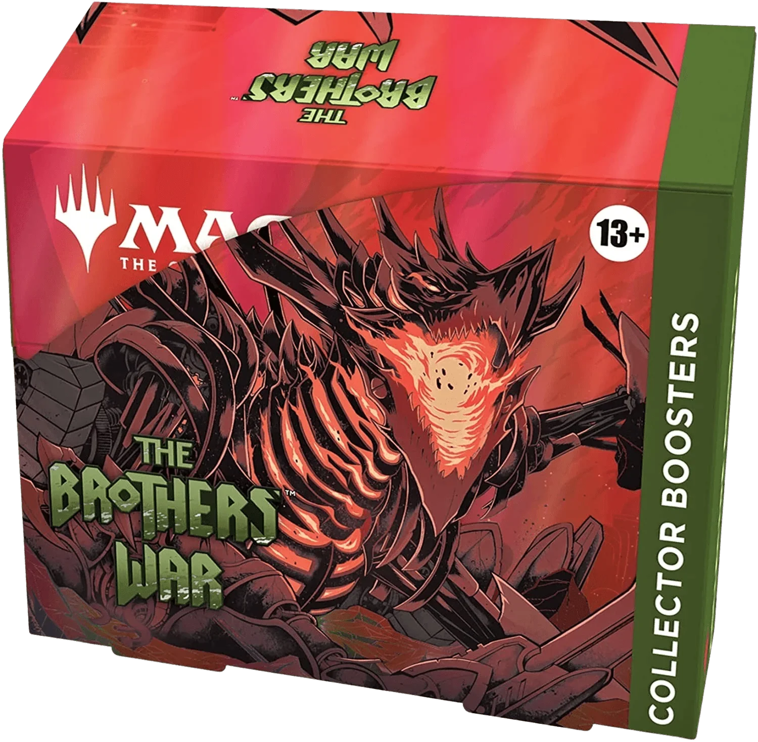 The Brothers’ War Collector Booster Box contains 12 The Brothers’ War Collector Boosters. Each Collector Booster contains 15 Magic: The Gathering cards and 1 Traditional Foil double-sided token, with a combination of 1 special Mythic Rare, 5 cards of rarity Rare or higher and 4 Uncommon, 4 Common, and 1 Land cards. Every pack contains a total of 10–11 Traditional Foil cards.