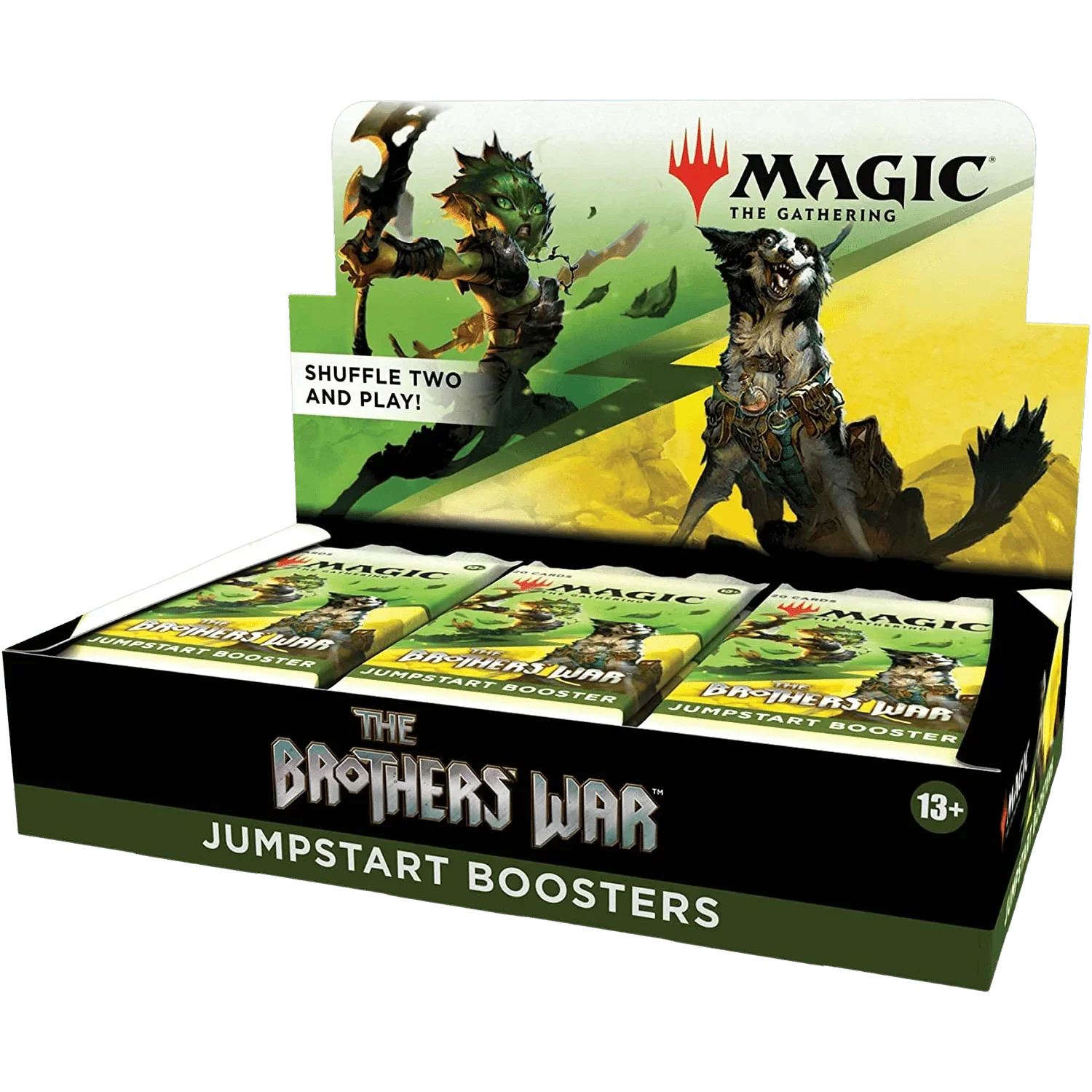 The Brothers’ War Jumpstart Booster Box contains 18 The Brothers’ War Jumpstart Boosters. Each booster has a theme. Just grab two packs and shuffle them together for wild combos and a unique gameplay experience that’s great for a quick, casual game, for older players looking to jump back in, or for giving new players a fun, simple way to learn the game. The Brothers’ War Jumpstart Boosters contain 20 Magic cards (including all the lands you need to play). In every pack, you’ll find 2 Rare cards, 1 of which may be a Mythic Rare, and 2 Land cards that are Traditional Foil.