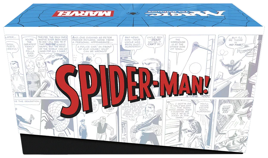 You’ll also find an exclusive traditional foil promo card with alternate art, a full set of foil and non-foil basic lands (each with five full-art versions), a Spider-Man themed storage box, an oversized Spindown life counter, and two reference cards.